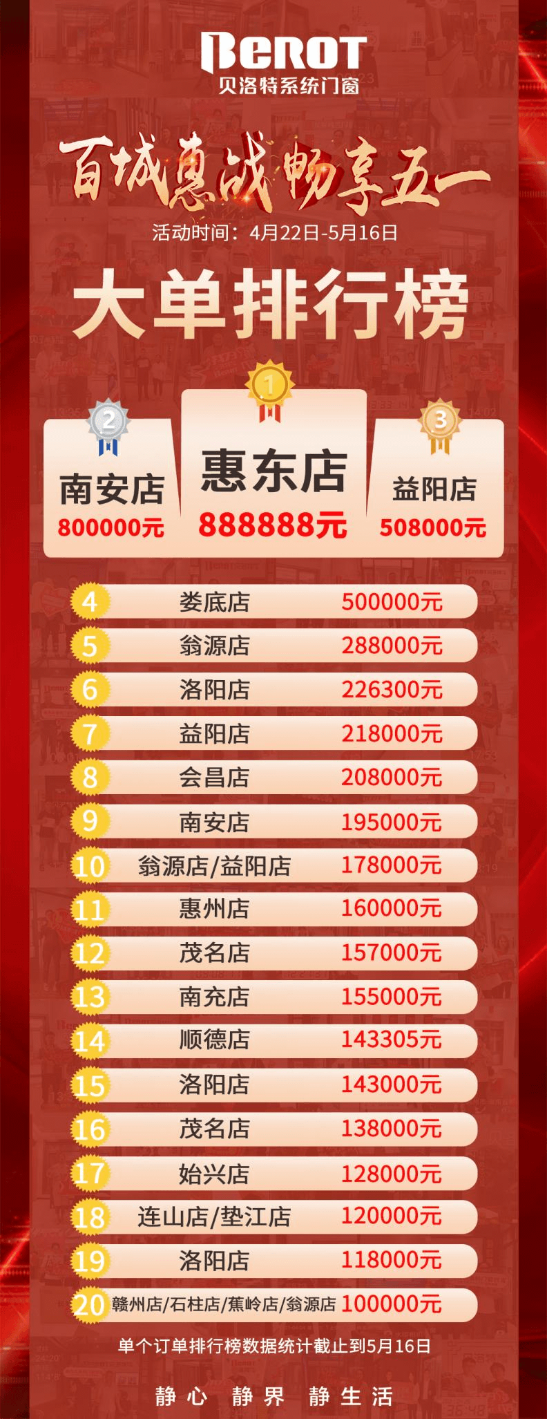 众力会聚,永恒耀六(liu)方!2021年4月(yue)22日(ri)-5月(yue)16日(ri)🌠,以“百(bai)城惠战·畅享五一劳动(dong)节”为主题的天下联动(dong)风暴囊括百(bai)城🔯、收(shou)成高(gao)兴!星际领航联袂天下经销商团队(dui)尽力以赴、全方位反(fan)击。